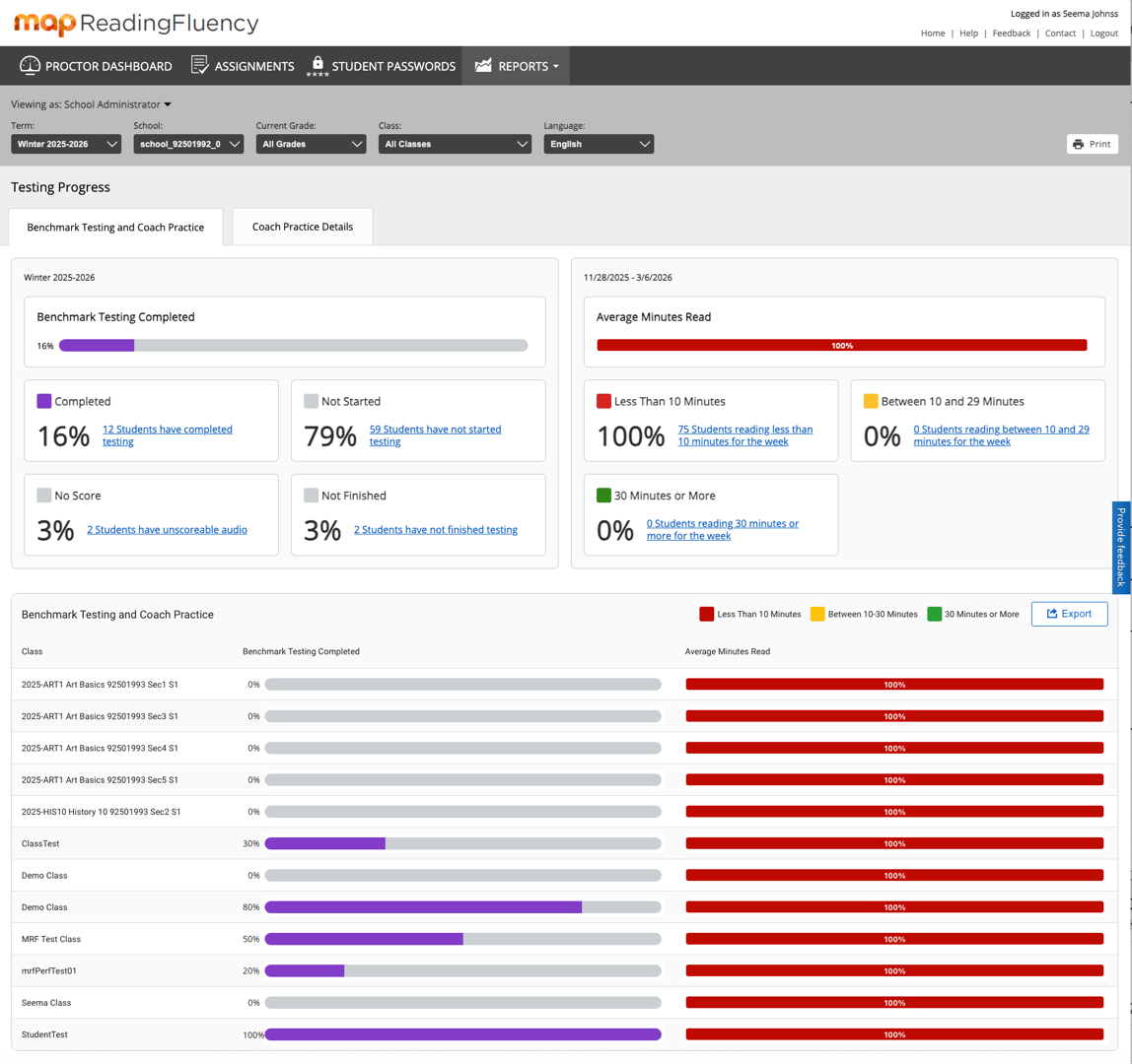 This report shows current term testing status for MAP Reading Fluency and weekly usage of Coach, providing an at-a-glance summary of student participation to teachers and administrators.