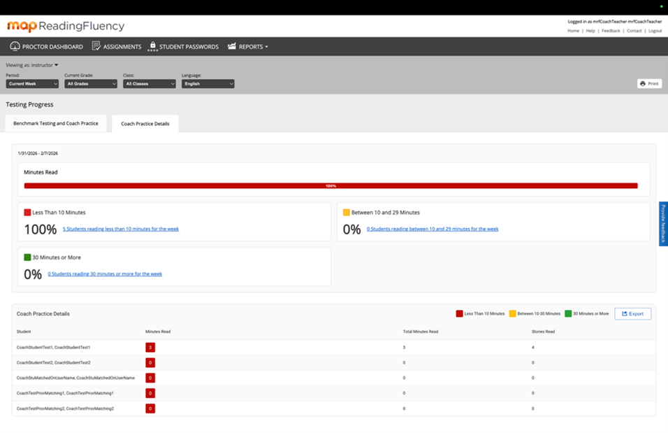 More detailed student Coach usage and results data is available from the Coach tile on the MAP Start Page under MAP Reading Fluency.